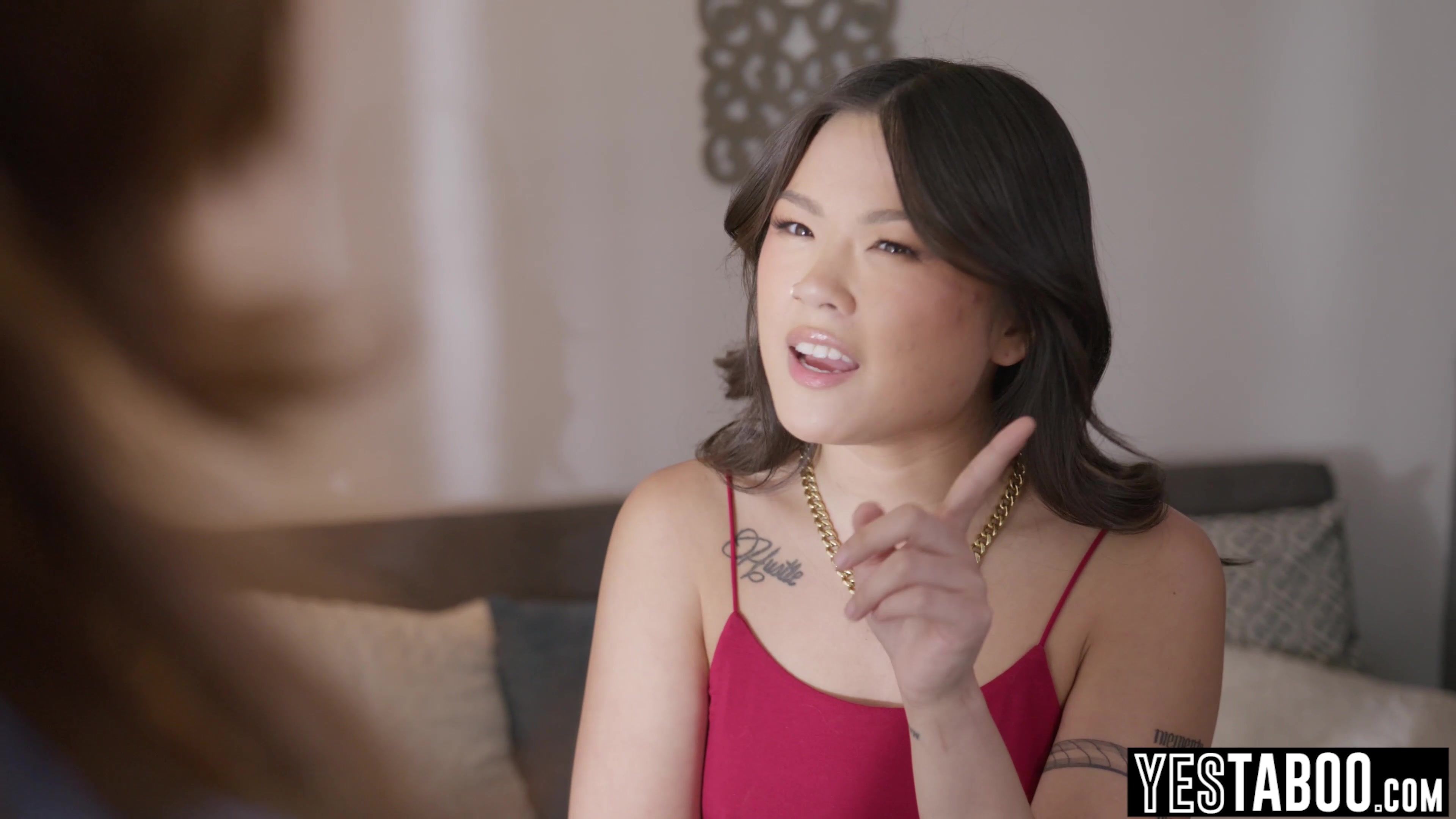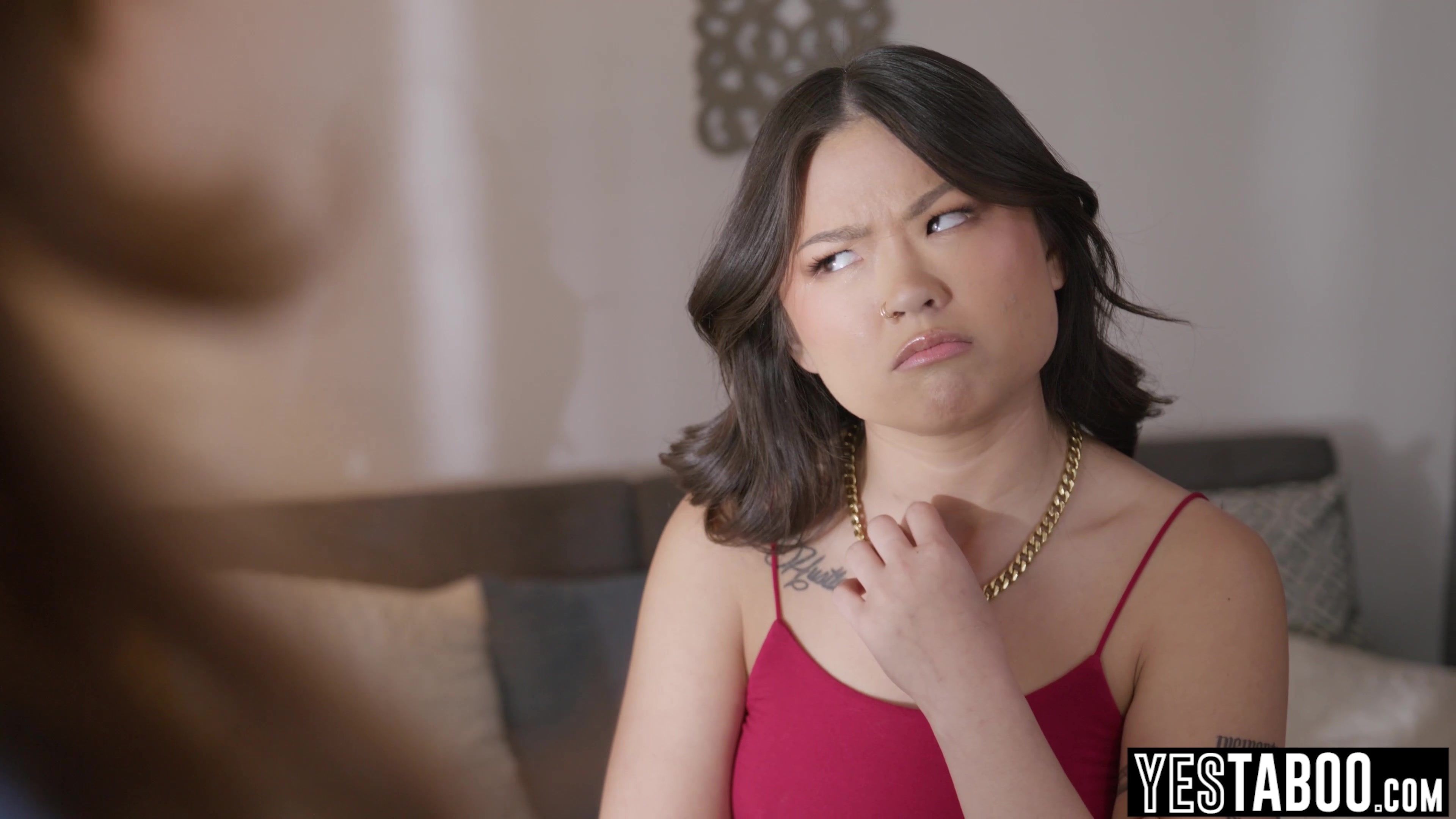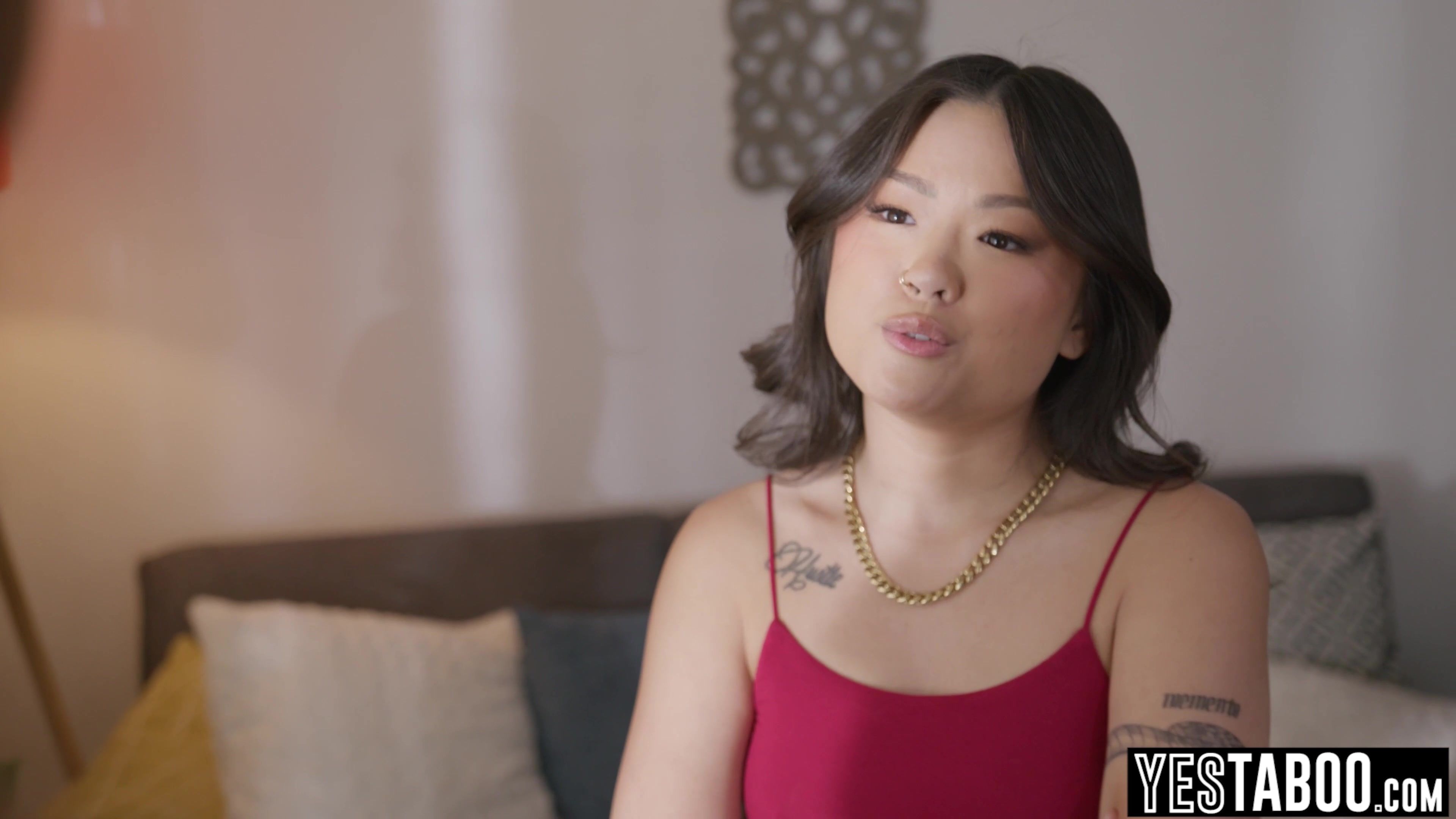 Petite Asian stepsister Lulu Chu caught her pervert stepbro peeping on their MILF stepmom Charlie Forde when she was changing and in order to keep her mouth shut she asks him to let her blow his big dick before making him rail her hairy teen pussy with it