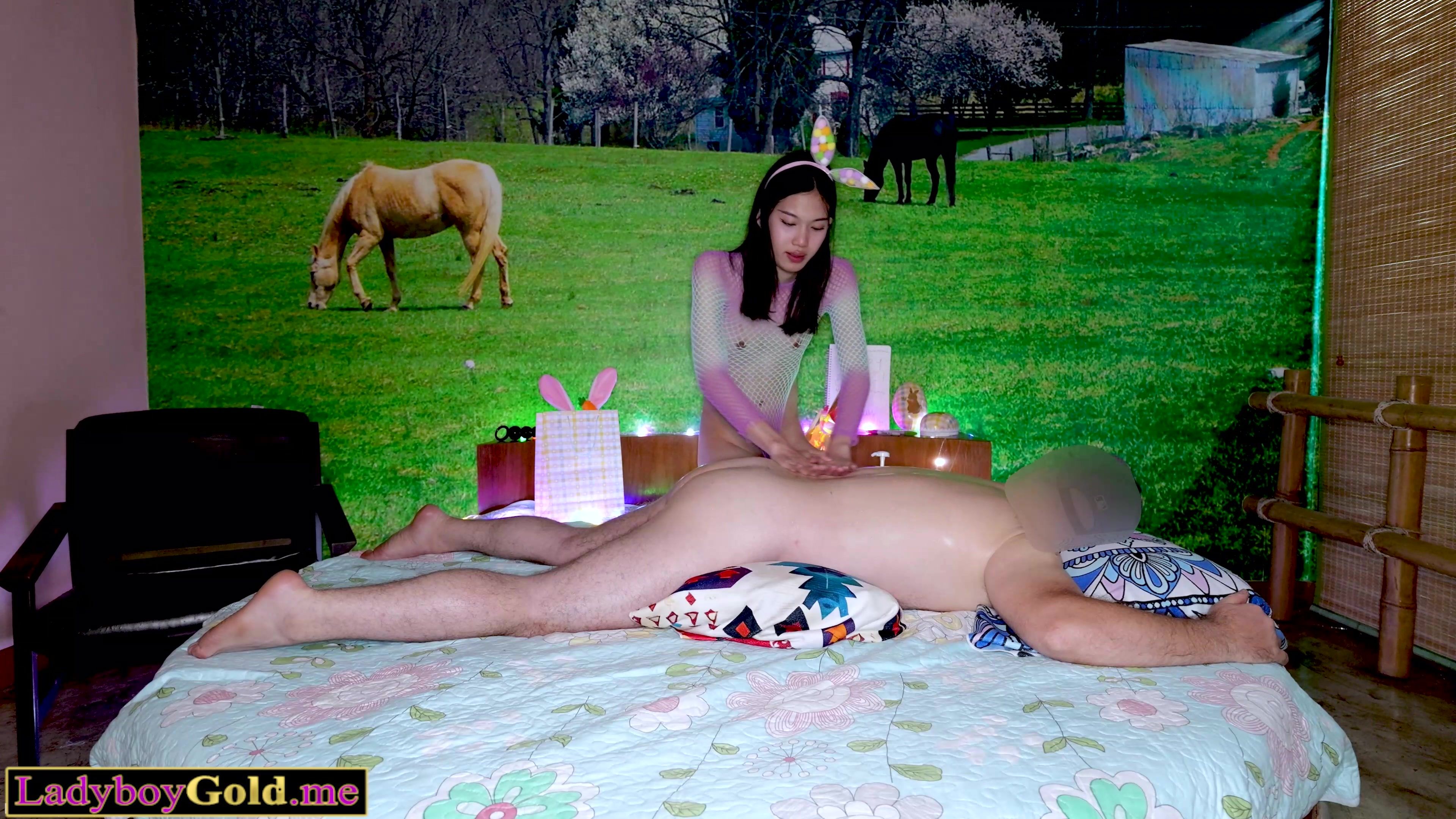 Extra skinny amateur Thai ladyboy teen Mayvi dressed in sexy fishent outfit is oiling and massaging her european clients back then she offers him happy ending She is caressing his hard white cock and giving him a handjob to empty his saturated balls